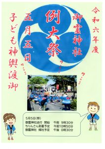 巡 行 日:2024年5月5日(日)集合場所:御霊神社集合時間:子ども 午前8時45分その他:雨天の場合は、決行のの可否を 当日朝に決定いたします。 幼稚園児のご参加は、必ず保護者同伴でお願いいたします。